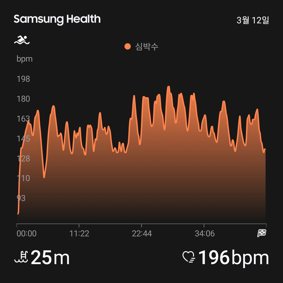 평균 심박수가 160 bpm에 최대 심박수 196 bpm으로 깔딱깔딱거리면서 했다. 평소 평균 심박수는 130 bmp 언저리.