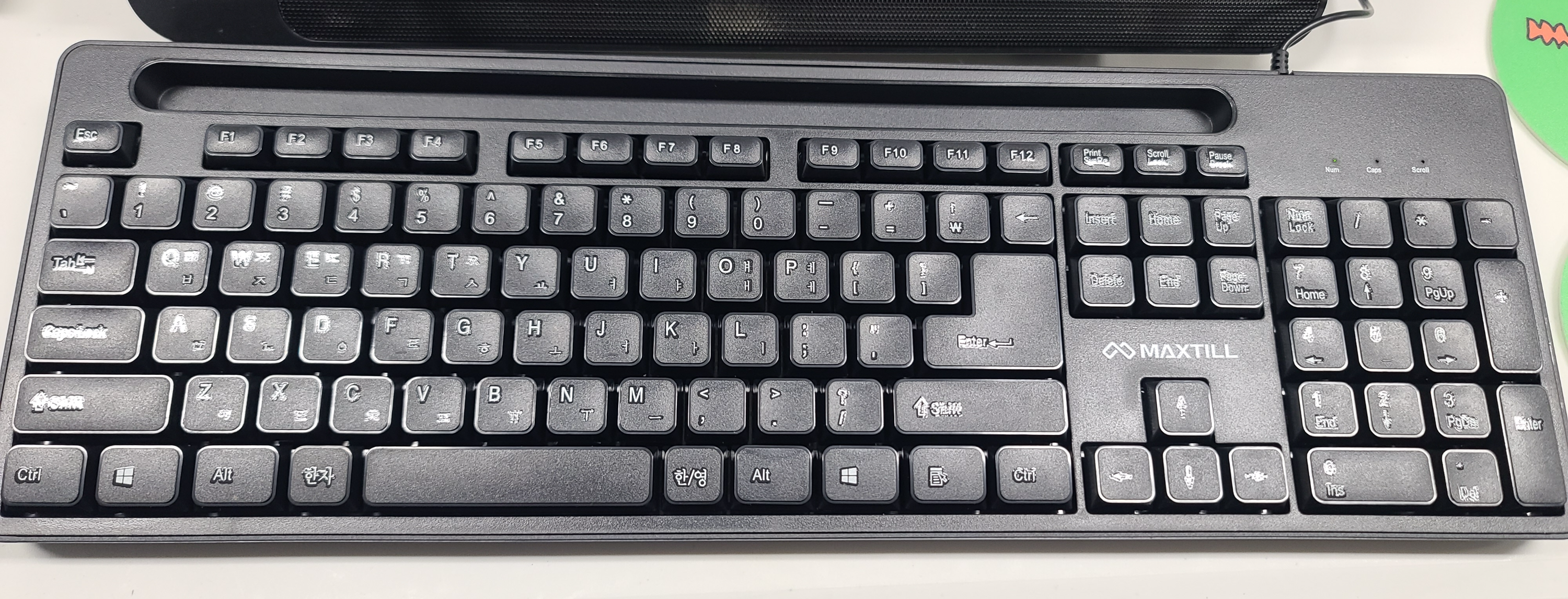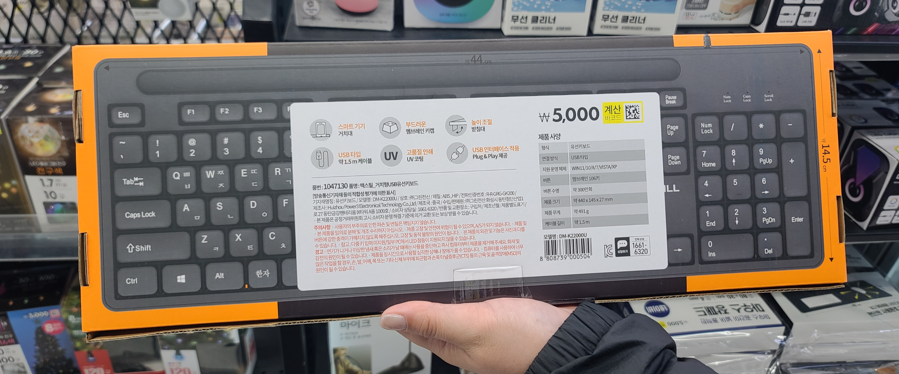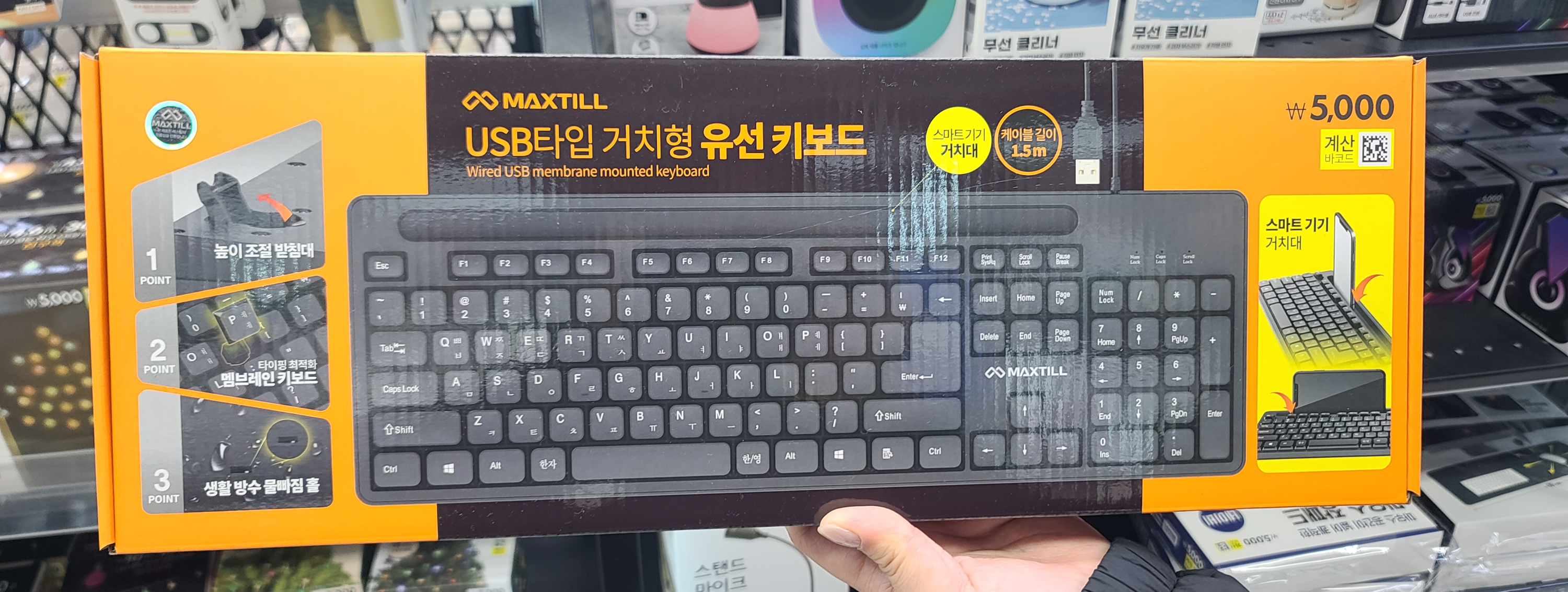 키보드는 내가 키감도 중요시하기에 살까 말까 고민이 됐지만 지금 이 글도 이 키보드로 쓰고 있는데 만족스럽다. 기본 키배열에 소음도 딱히 없고 적당히 눌렸을 때 눌렸다는 느낌이 나는 키감이라 괜찮은 거 같다. 얼마 전에 인터넷으로 HP 유선 키보드를 샀었는데 키감이 누른 지 안 눌렀는지 모르겠어서 별로였는데 이건 좋다. 그냥 무난히 쓰기 나쁘지 않고 5,000원이니 급한 대로 사서 써보고 별로면 바꾸면 되니 부담 없이 한번 써보는 걸 추천한다. 스마트폰 거치대라고 홈이 파여있는데 내 휴대폰은 굴빵해서 거치가 안된다.