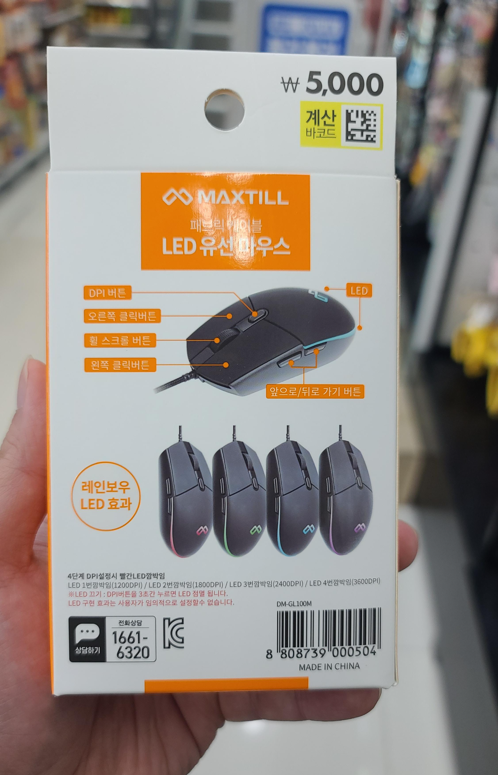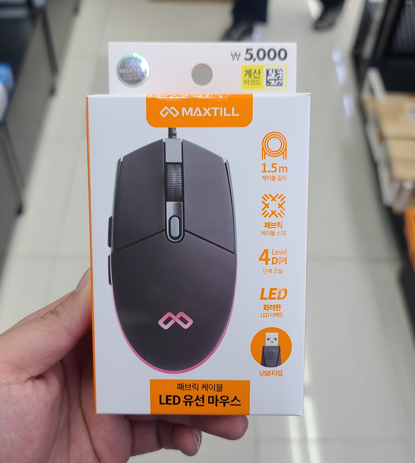 무선 마우스 배터리가 다돼서 그냥 유선 마우스 하나 살려고 다이소에 가보니 MAXTILL 제품만 있었다. 많이 익숙한 브랜드인데 다이소에도 입점했구나 싶었다.