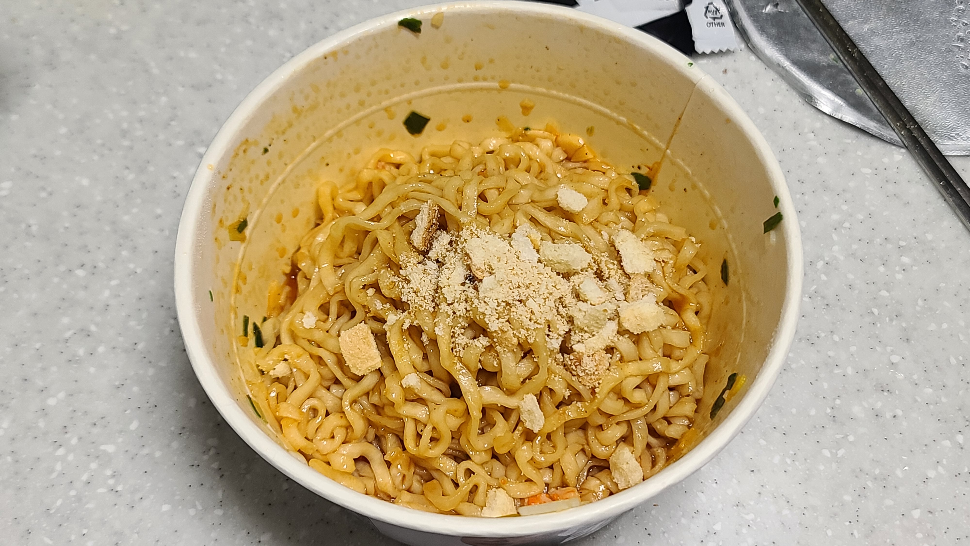 간이 좀 더 되고 빵가루 비주얼에 기대를 하고 있는 소비자의 욕구에 맞게 고소한 맛도 났으면 아주 좋았을 것 같다. 재구매는 없을 거 같다. 다른 맛있는 컵라면이 많기 때문.