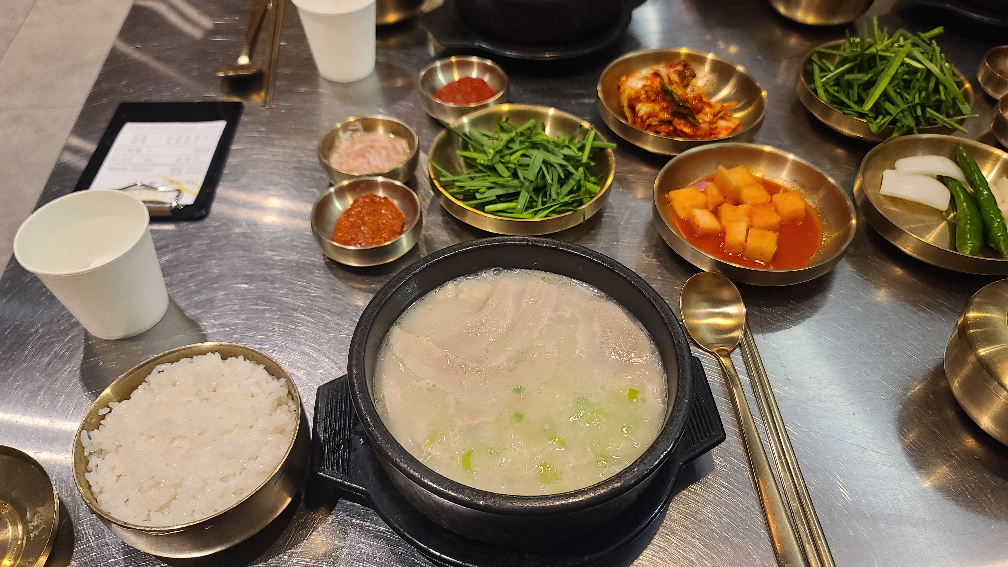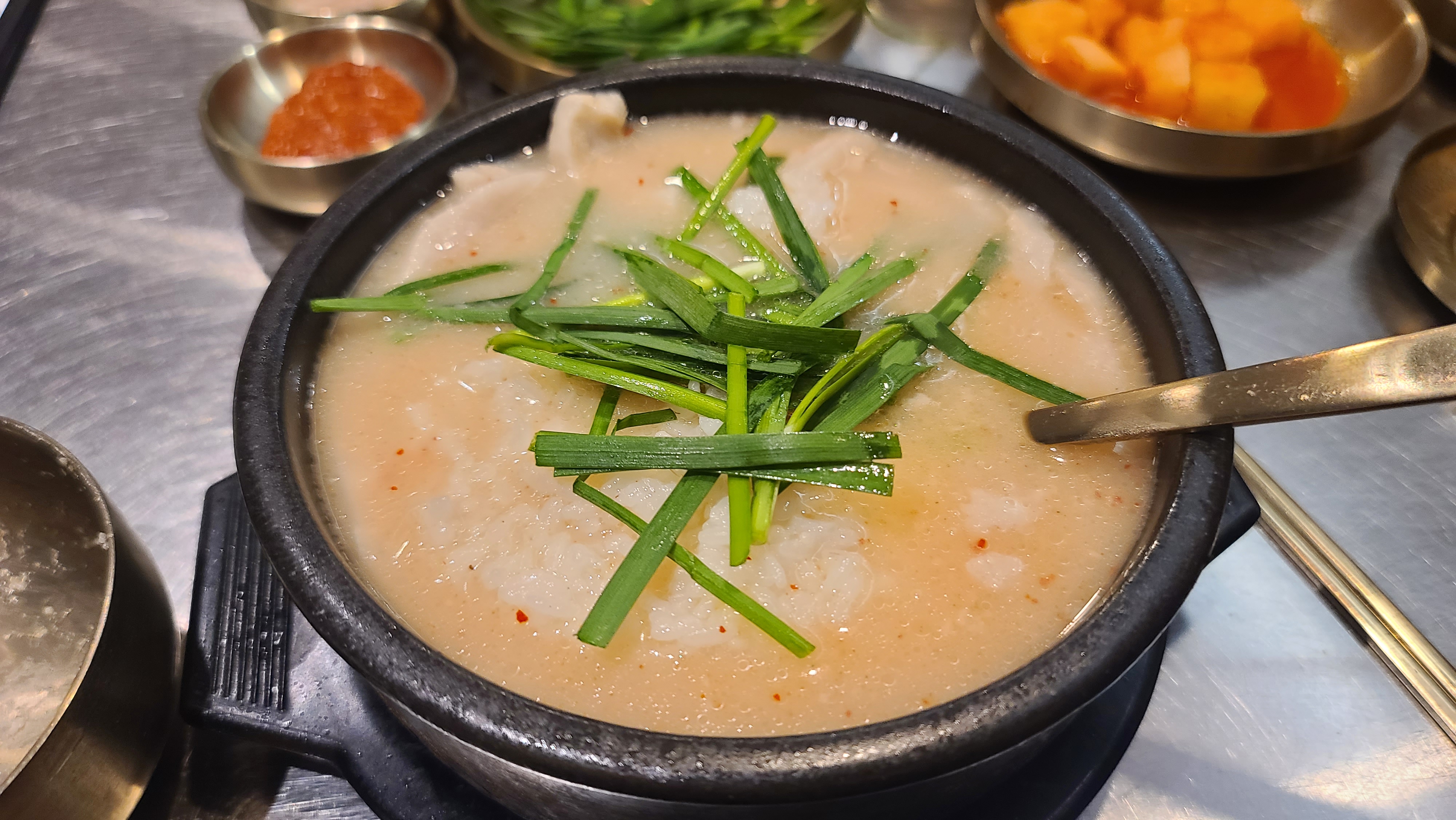 쌈장, 새우젓, 다대기 뭐 기본적인 건 시판을 그대로 사용한다. 배추김치는 내 스타일이 아니었고 깍두기는 맛있었다. 밥을 국물에 말면 전분이 풀려 국물이 더 맛있어지기에 나오자마자 뜨거울 때 바로 밥을 마는 스타일로 먹는다. 경상도니 부추도 넣어 주었다.