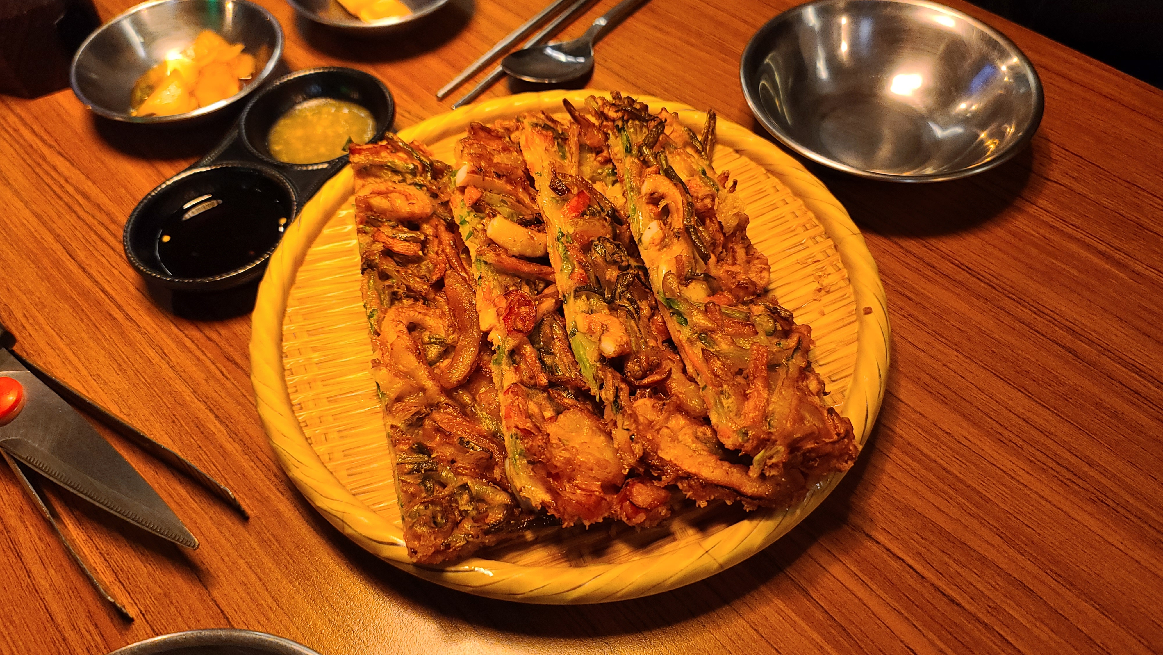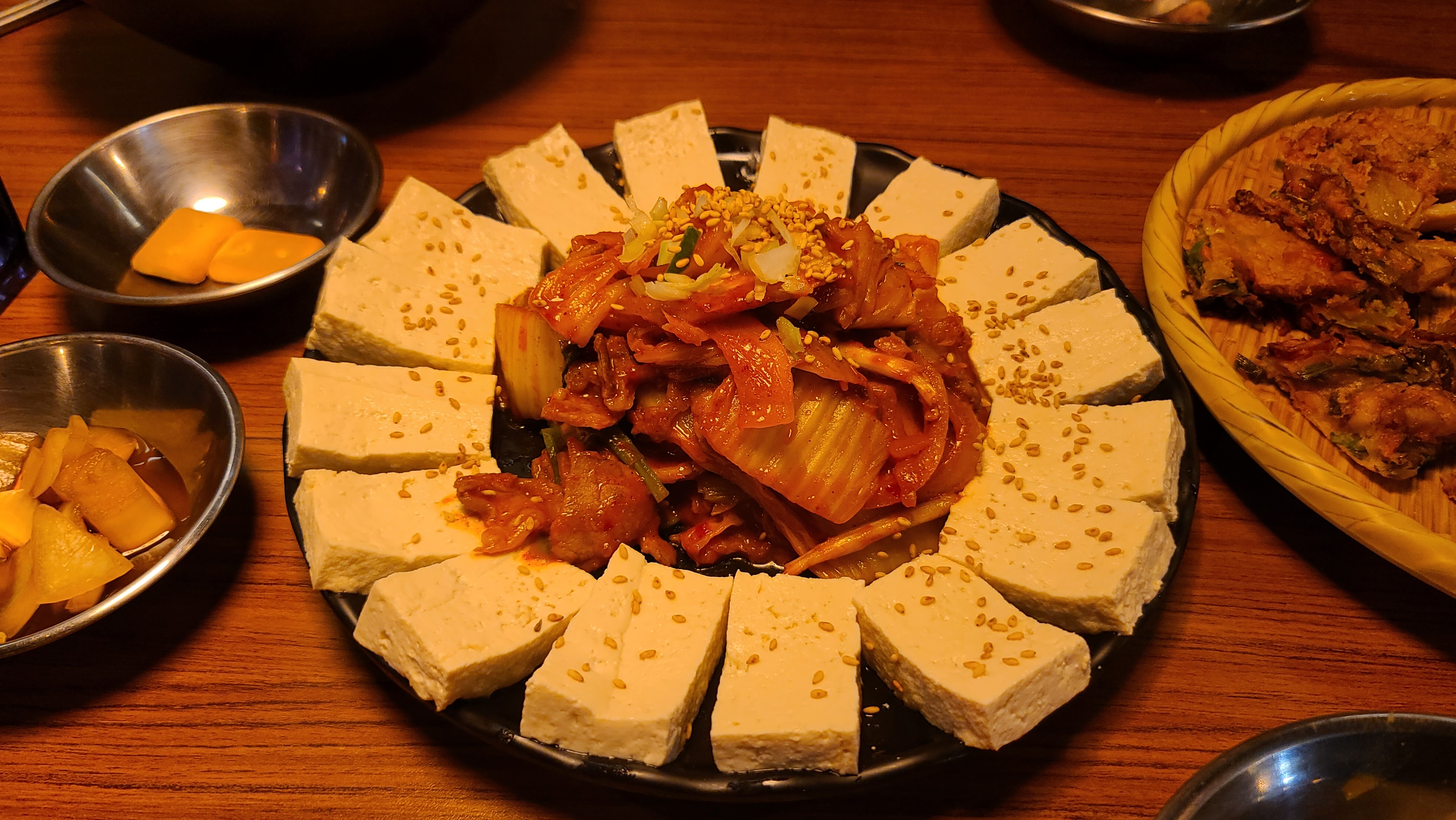 파전은 너무 두껍고 딱딱하면서 맵다. 어디에도 맵다는 고지가 없어서 먹자마자 당혹스러웠다. 두부김치의 두부는 괜찮은 퀄리티지만 볶음 김치가 케첩 맛이 나고 별로였다. 고기도 조금 들어있음.