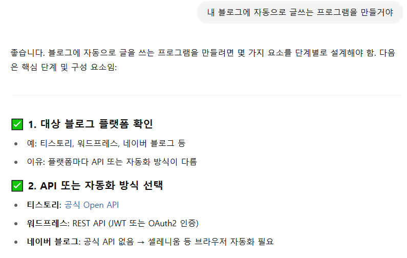 먼저 첫 번째로 어떤 블로그인지 플랫폼 확인을 하라고 한다. 나는 당연히 이 블로그에 자동으로 글을 써주는 프로그램을 만들거니 티스토리다. 두 번째로 API 또는 자동화 방식 선택이라고 하는데 찾아보니 티스토리 공식 Open API는 2024년 2월까지 서비스하다가 종료되었다.