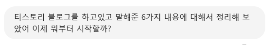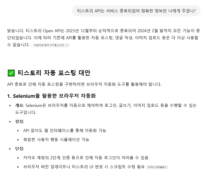 GPT는 티스토리 API가 아직 사용 가능한 줄 알고 API 연동부터 알려주기 시작했다. 하지만 사전 조사에서 API는 서비스 종료된 걸 확인했기 때문에 다시 질문을 했다.