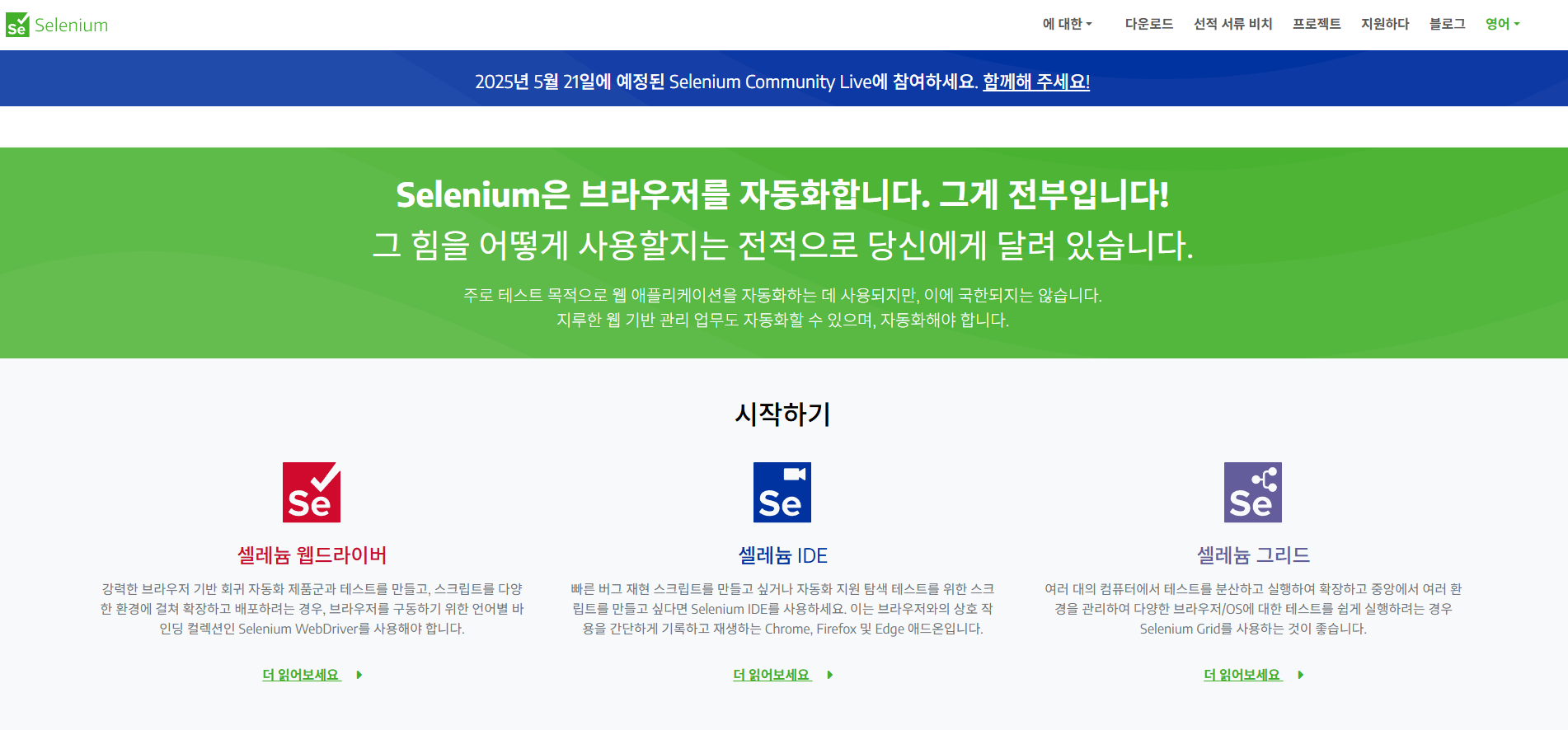 최소 자바 버전 17 이상이고 https://www.selenium.dev/downloads/ 이 주소에서 다운로드 가능하다. 자바 말고도 C#, Ruby, Python, JavaScript를 지원한다.