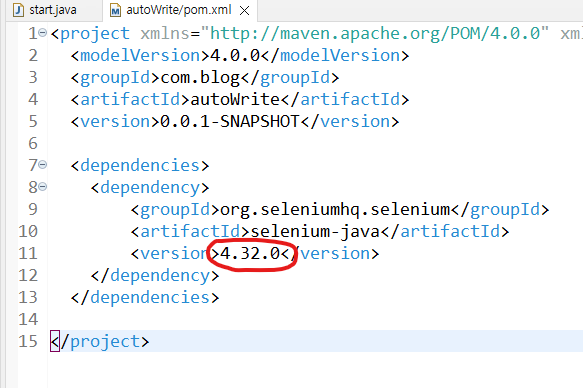 pom.xml에 안정적인 버전을 추가하였다. 이로써 셀레니움이 설치된 프로젝트 생성을 완료하였다.