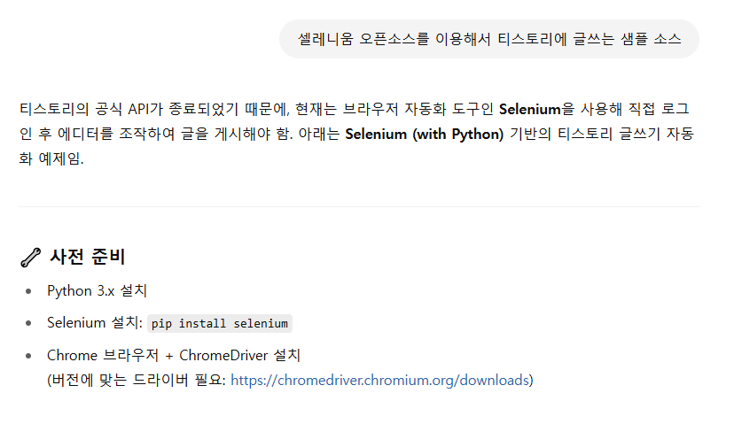 | 티스토리 자동 글쓰기 도전기: 셀레니움으로 시작한 100개 글 프로젝트 (2) | 2025.05.19 |