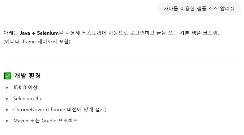 먼저 ChatGPT에게 셀레니움 샘플 소스를 만들어달라고 해보자.