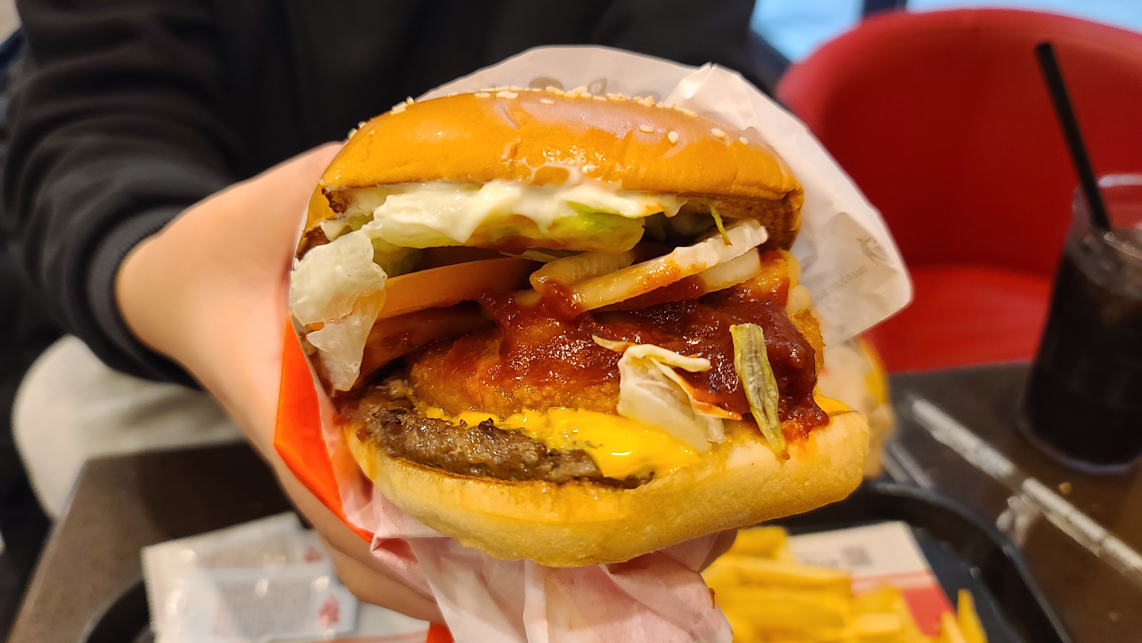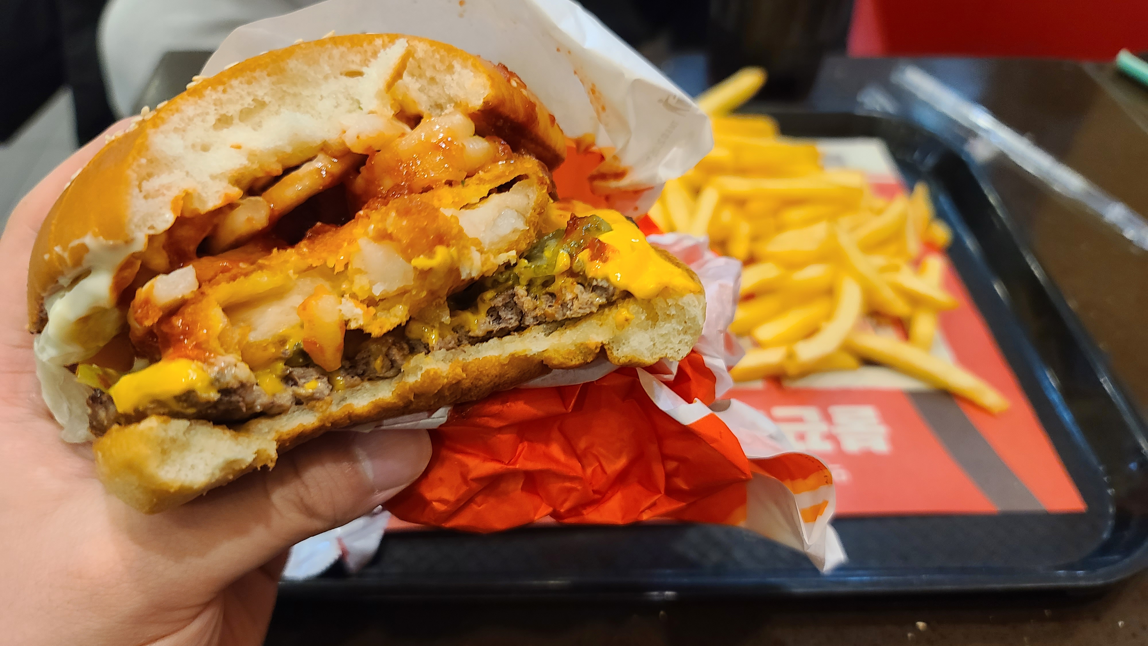 소스는 매콤한 몬스터 엑스 소스의 재탕이고 고기 패티의 맛은 해물 패티의 비린 냄새와 강력한 소스로 묻혀 나지 않는다. 버거를 먹으면서 해물 비린내가 너무 심해서 이 버거는 강력 비추한다! 이 지점만 그런 건 아닌지 모르겠는데 먹어보신 분이면 댓글로 후기 좀 알려주시라~