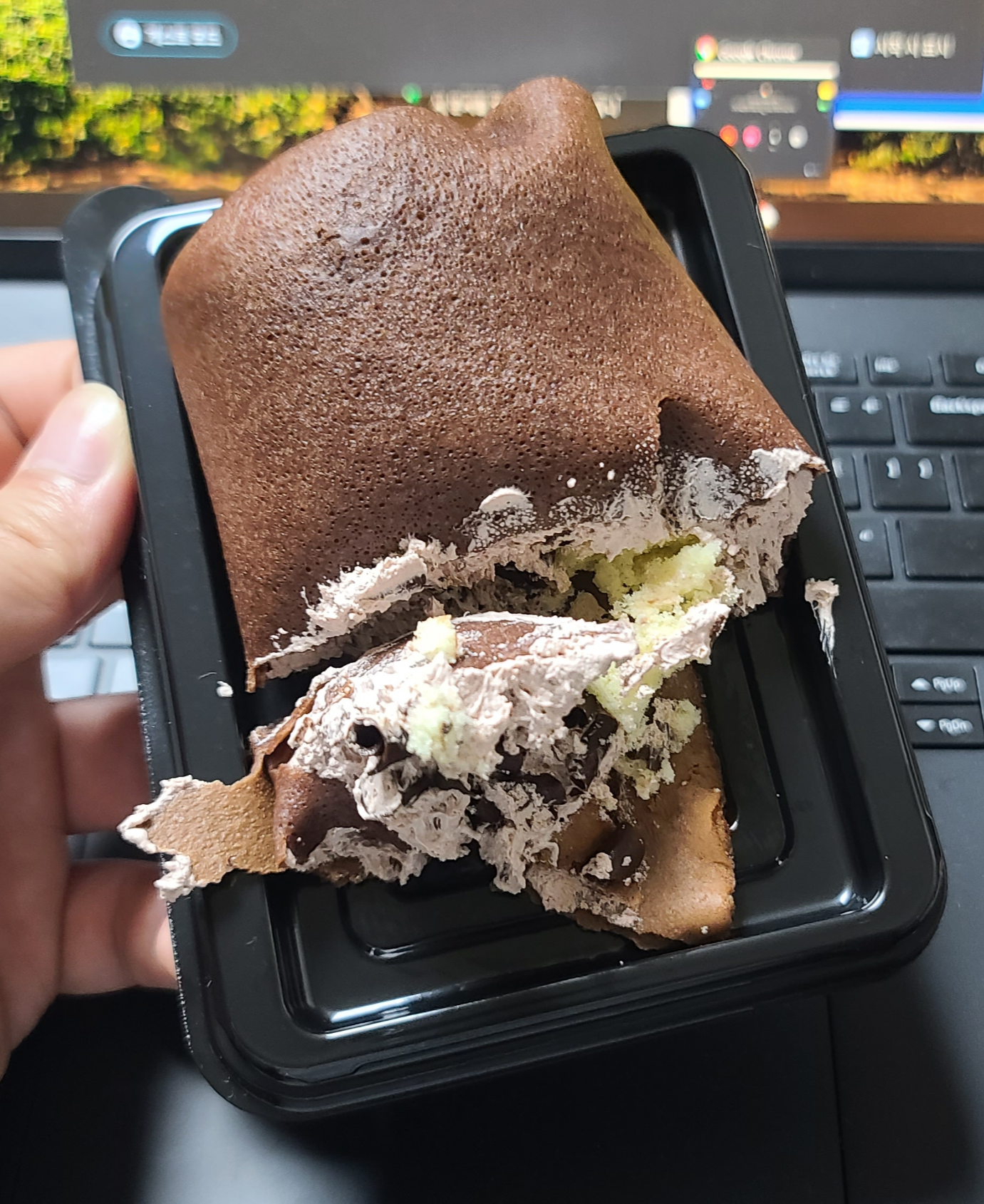 크레페 같은 얇은 빵에 안에 촉촉한 크림이 가득하다. 한입 넣으면 달다리~ 촉촉~ 하며 부드럽다. 초콜릿 조각이 들어 있는데 제법 굵기가 있어 식감의 포인트다.