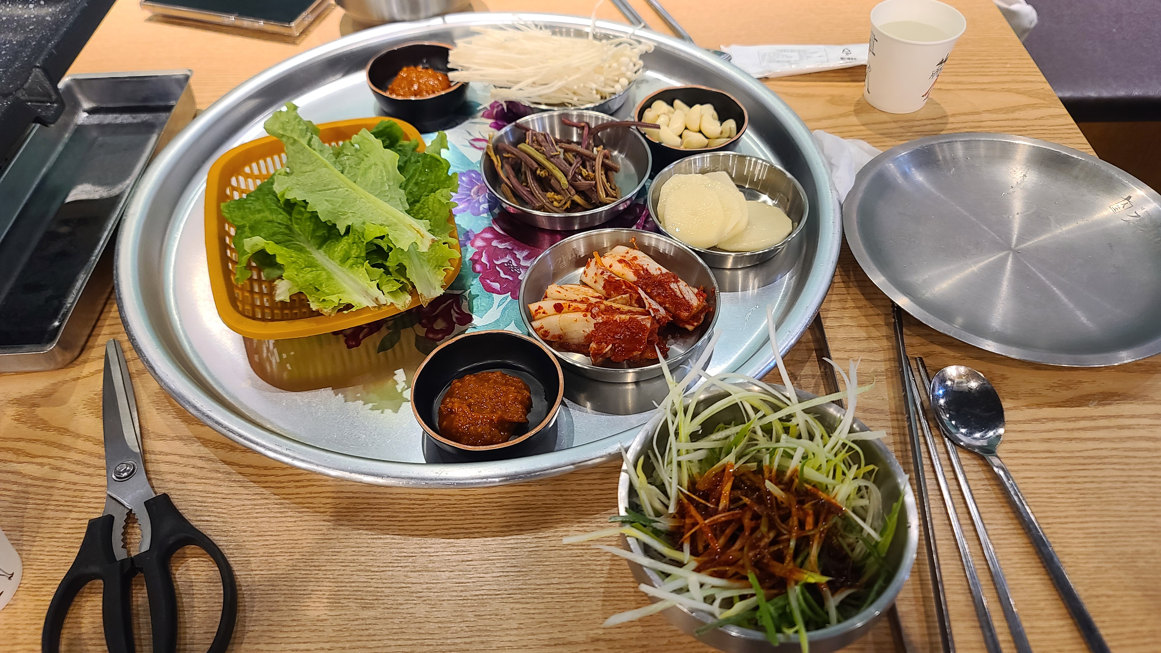 기본 대패를 바짝 구우면 안 되고 살짝 구워서 먹어야 맛도리다. 꽃삼겹, 가브리, 냉삼, 양념고기 등 있지만 내 기준 이베리코 대패가 1짱이고 기본 대패가 2짱이다. 양념고기는 별로다.