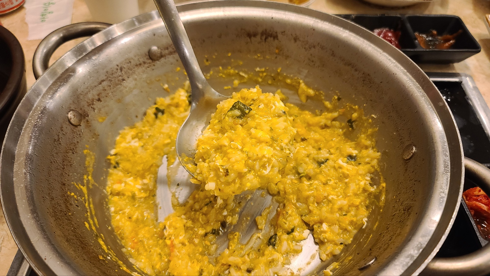 찐국이 돼버린 육수에 흰밥, 호박, 계란을 넣고 호박을 으깨서 죽을 만드는데 꼬소함과 감칠맛의 최상이다. 이 맛에 샤브 먹지!