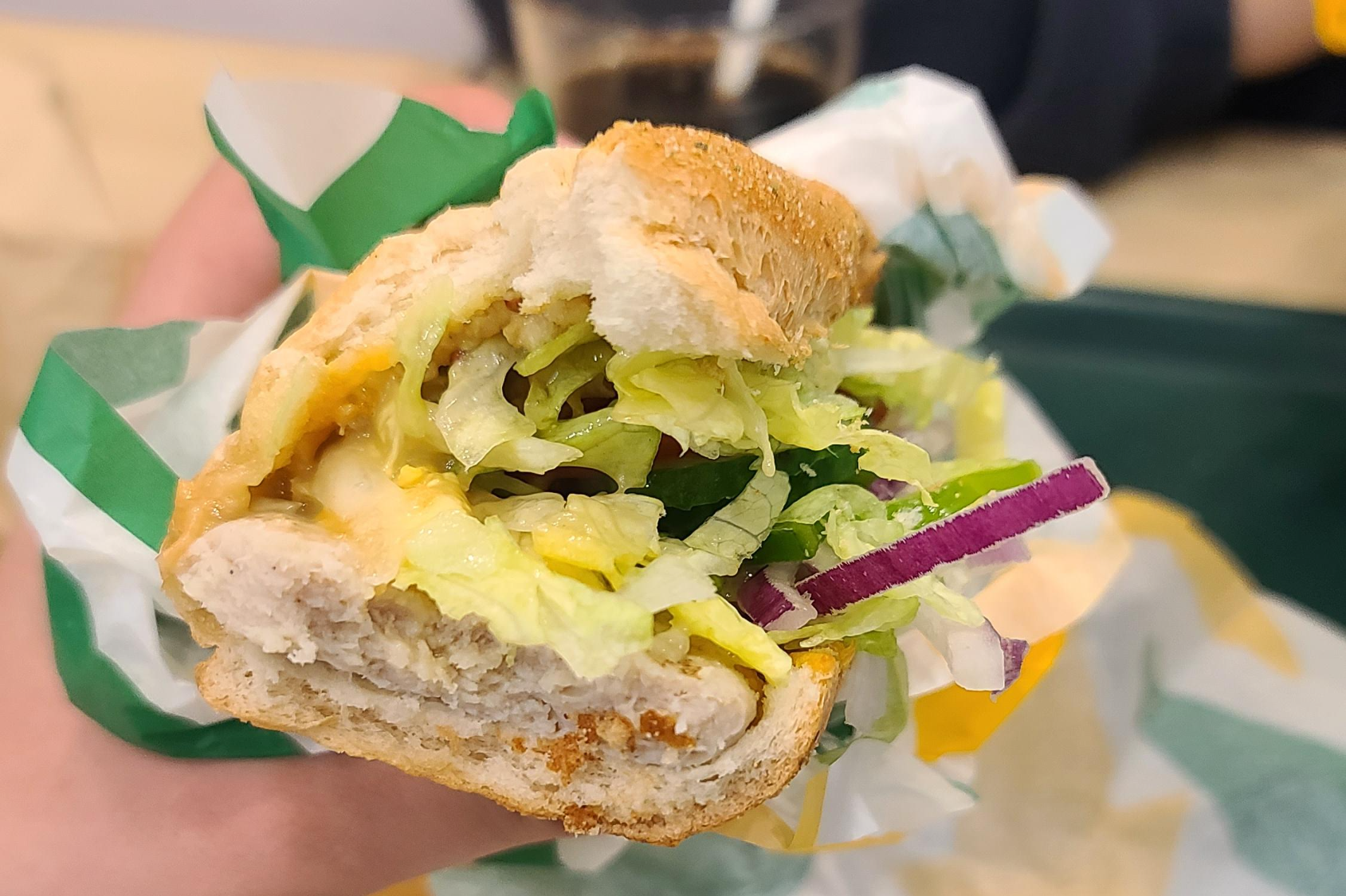 바게트 빵에 닭가슴살을 샌드위치 해먹는 느낌인데 닭가슴살이 정말 부드럽고 맛있어요. 소스는 두 개가 들어갔지만 머스타드맛 밖에 느껴지지 않았어요. 야채도 많아서 아주 건강한 한 끼를 먹는 것 같아요.