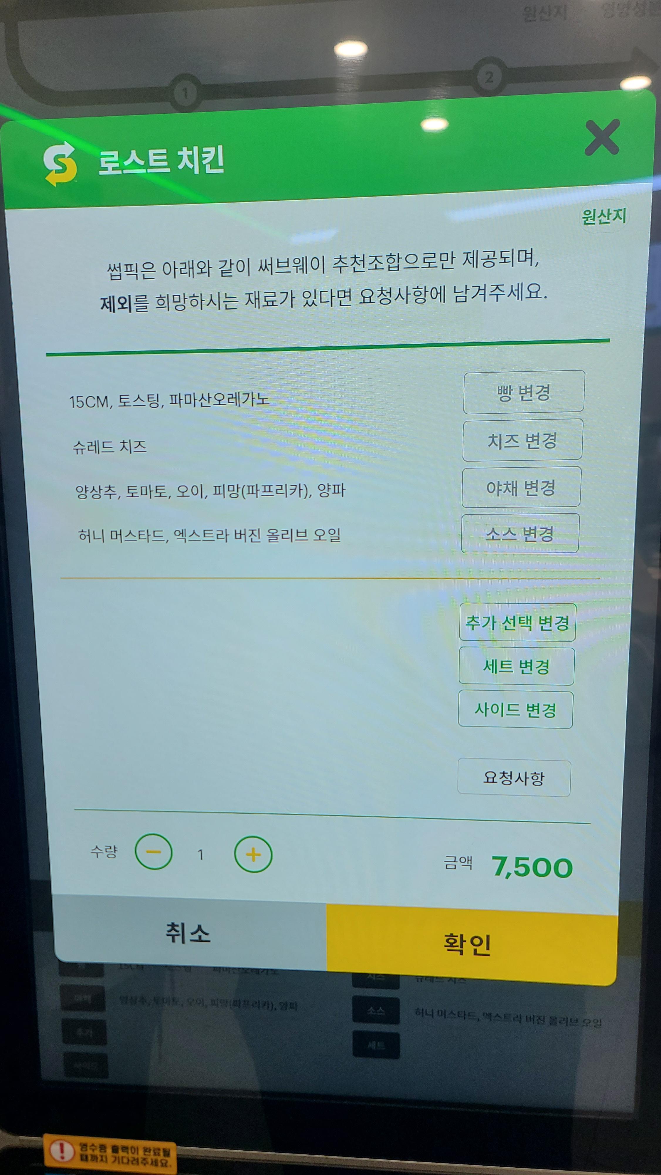 행사 메뉴는 눌려도 썹픽이 안 뜨는데 일반 메뉴 화면에서는 선택을 하면 썹픽을 할 건지 묻는 창이 떠요. 개인적으로 치즈는 뭘 선택해도 맛이 잘 안 나고 비슷해서 모르겠네요. 로스트 치킨 썹픽은 빵 파마산오레가노 소스는 허니 머스타드, 올리브 오일이 자동 선택이 되네요.