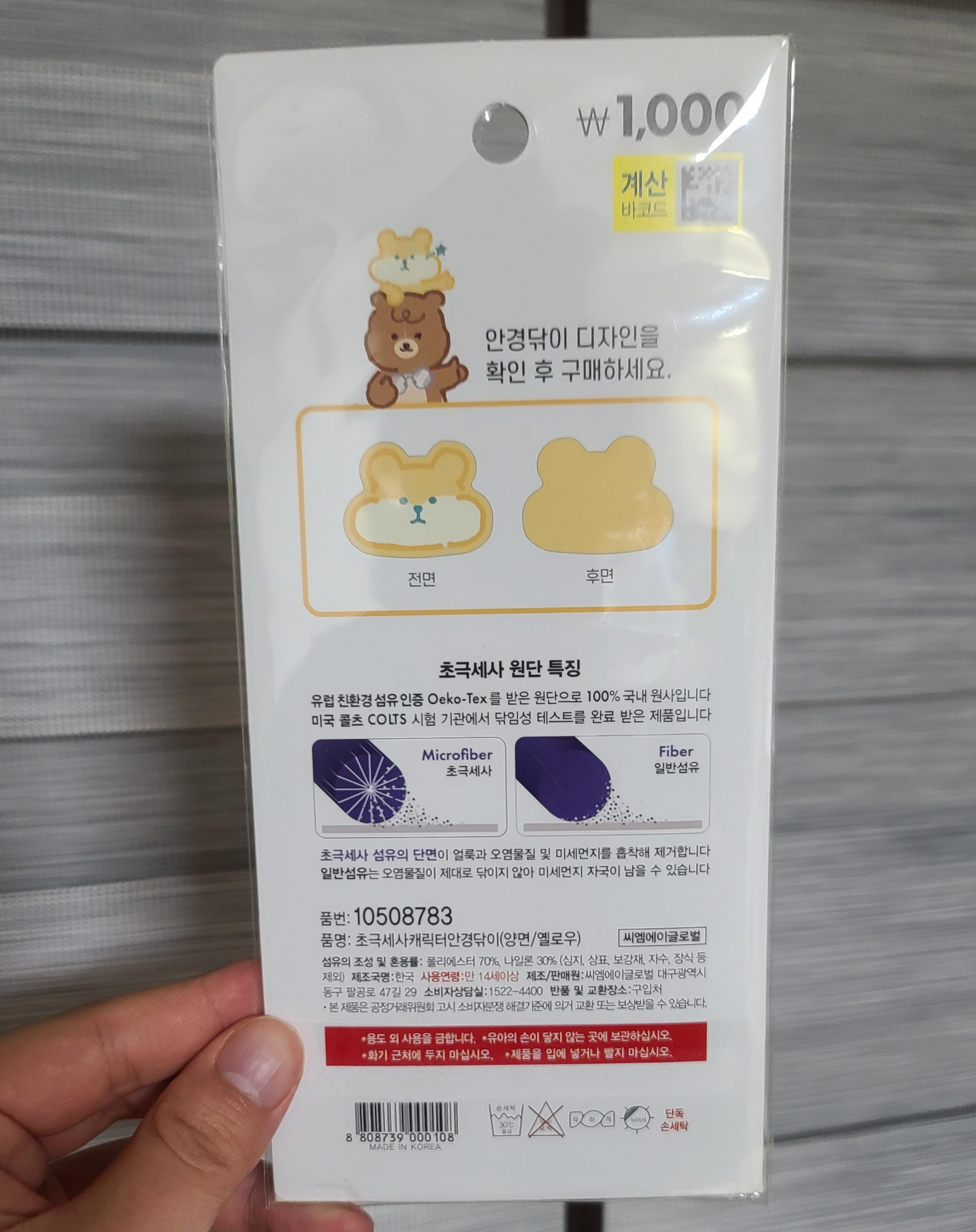 유럽 친환경 섬유 인증 Oeko-Tex를 받은 100% 국산 천, 미국 콜츠 COLTS 시험 기관에서 닦임성을 테스를 완료받은 어마 무시한 스펙의 안경닦이다. 천 원짜리에 엄청나다.