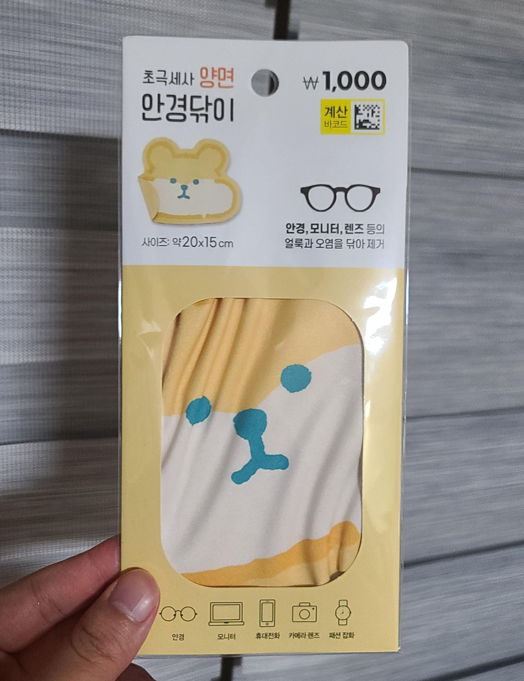 휘뚜루마뚜루 쓸려고 다들 구매하지 싶다. 그래도 처음 꺼내보았을 때 재질에 실망할 것이다. 하지만! 안경을 닦아보니 잘 닦인다! 엄청난 가성비를 가진 다이소 안경닦이 하나쯤 구매해도 좋습니다.